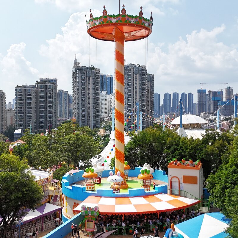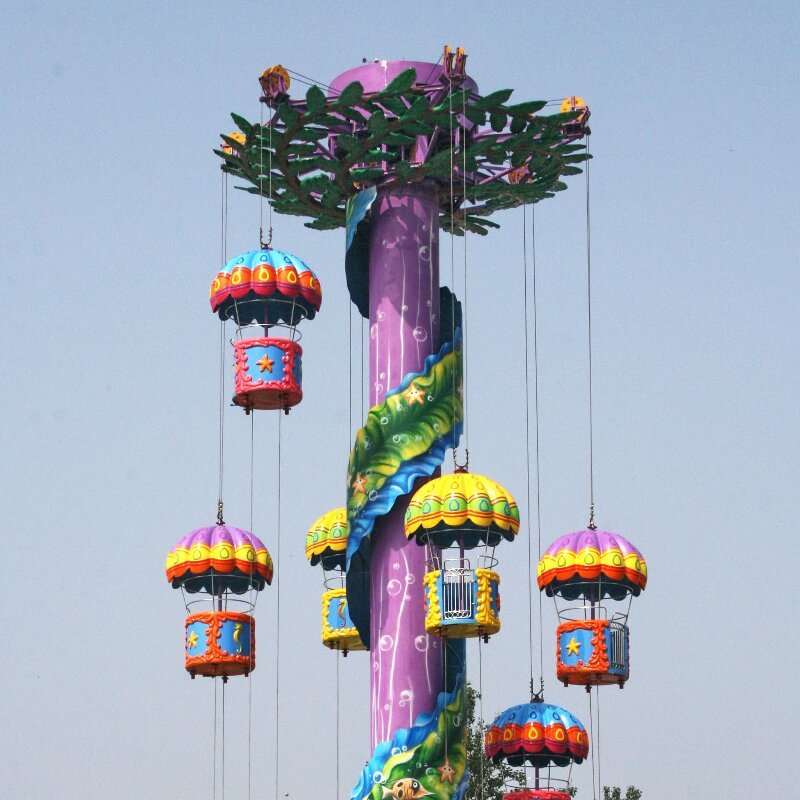 Menara Jatuh Bebas Bertema Parasut adalah wahana hiburan yang seru dan ramah keluarga, dirancang untuk memberikan pengalaman jatuh bebas yang mendebarkan dengan desain bertema parasut yang cerah. Menampilkan gondola berwarna cerah yang digantung dari menara pusat tinggi yang dekoratif, atraksi ini menggabungkan sensasi adrenalin jatuh bebas dengan pemandangan indah yang menakjubkan, menjadikannya pusat perhatian yang sempurna untuk taman hiburan, pusat hiburan keluarga, dan taman bermain.